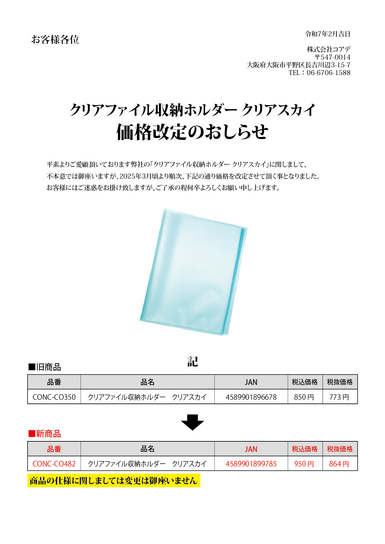 ・クリアファイル収納ホルダークリアスカイ価格改定のおしらせ
