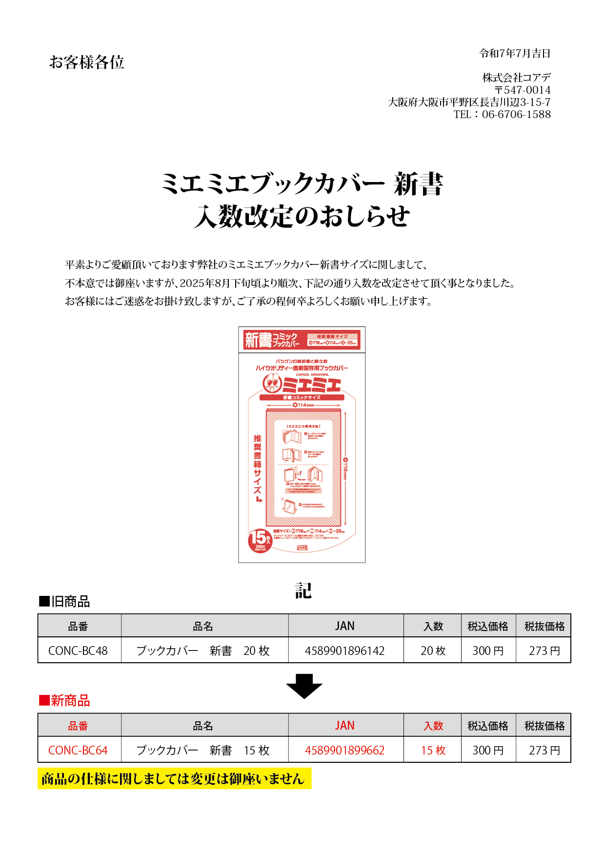 ・ミエミエブックカバー新書サイズ入数改定のおしらせ